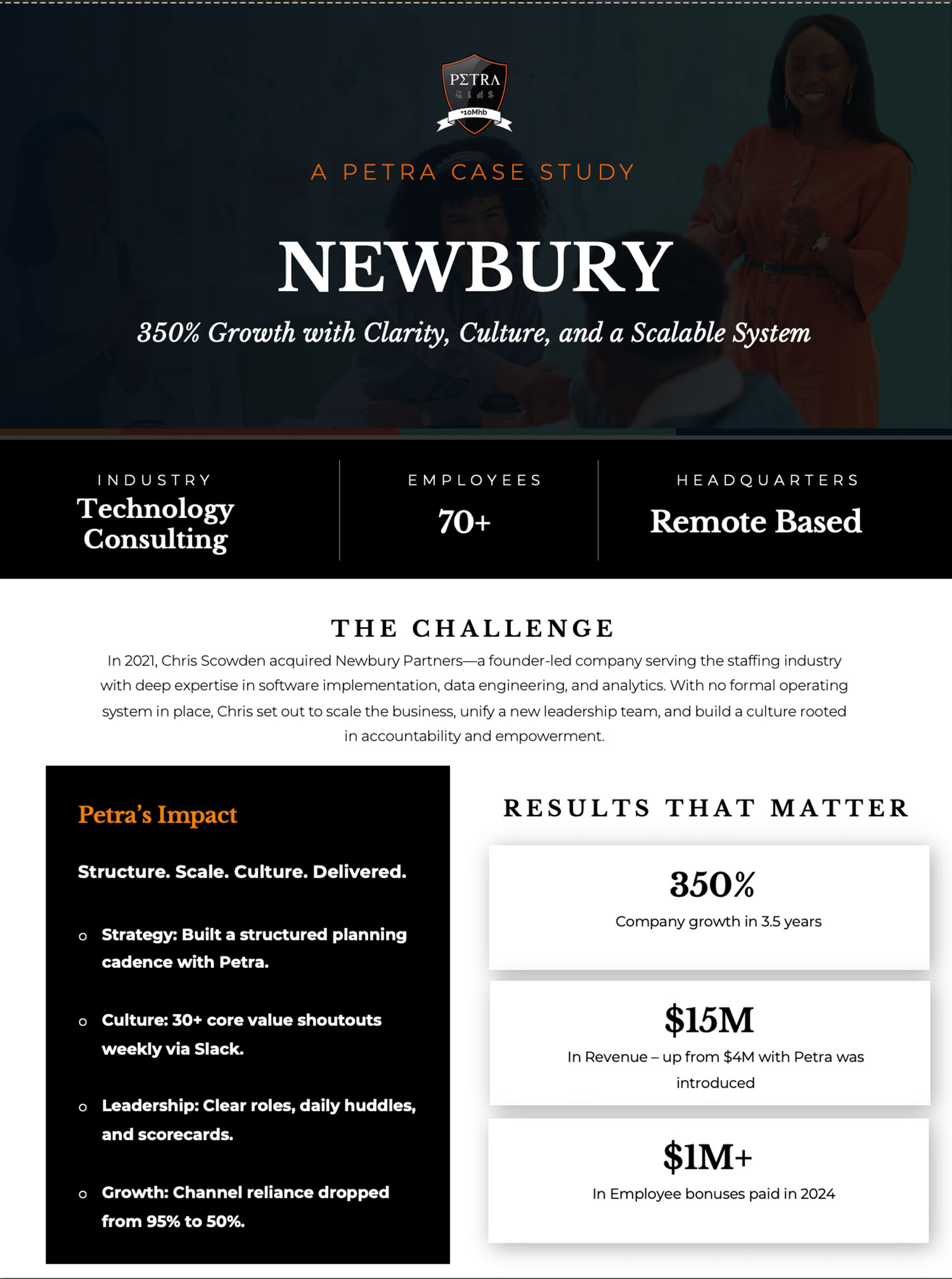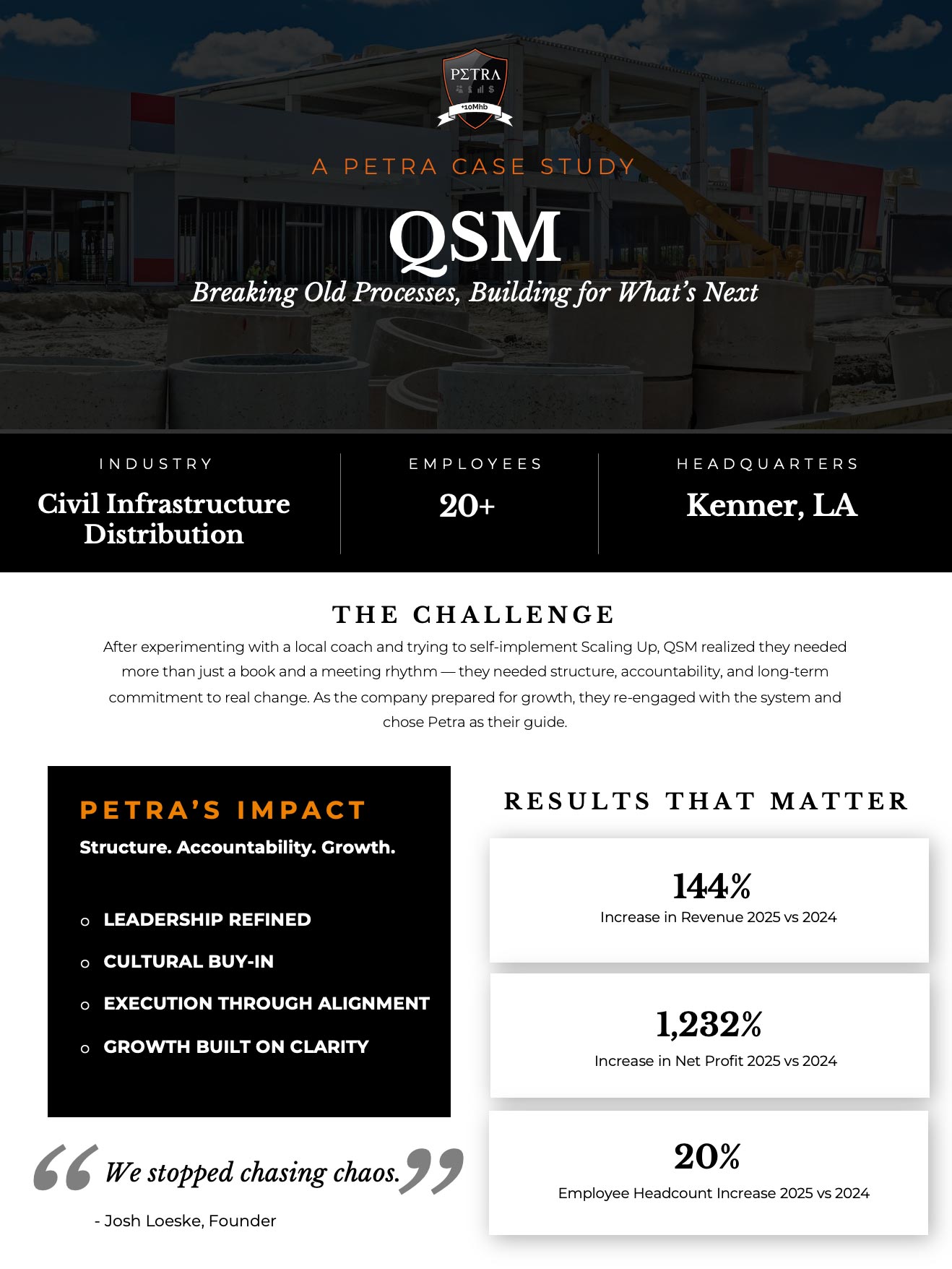 Petra has developed a highly effective, team-based approach for implementing the Scaling Up process that enables a company to optimize its long-term success by engaging and aligning its team members on the most important priorities each quarter.